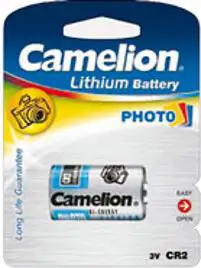 -'Camelion CR2-BP1R. Tehnologija baterije: Lithium, Trajanje baterije: 850 mAh, Napon baterije: 3 V. Težina: 11 g, Visina: 27.2 mm, Promjer: 15.2 mm. Dimenzije ambalaže (ŠxDxV): 84 x 16.5 x 114 mm'