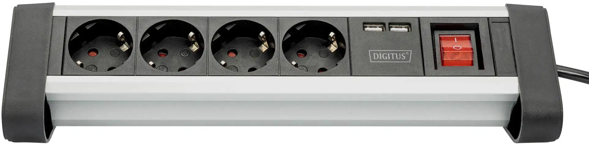 The Digitus socket strip offers four Schuko sockets as well as two USB ports for charging mobile devices. The entire strip can be switched on or off by means of an Illuminated safety switch. The safety plugs are arranged in a 45° angle and are thus also suitable for right angle plugs. These are always equipped with a child safety device, and plastic covers close the contacts on the sockets. Thanks to the lateral bracket, the socket strip can be rotated through 290° and thus adapts to the desired application scenario. This can be installed quickly and individually by means of the supplied (height-adjustable) clamp mounts. However, it also lends itself to a fixed mounting by means of 3M screws. The appropriate mounting lugs are available. The cable length of the power cord is 1.5m. The whole thing is topped off with a high quality aluminum casing. Fits into any surroundings due to its simple design.