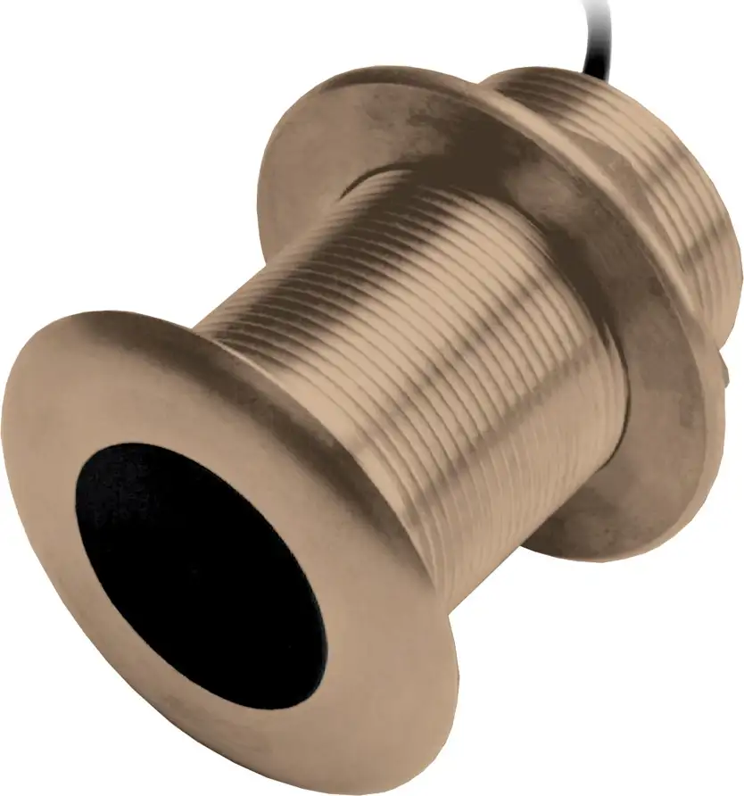 This 8-pin 300 W bronze thru-hull mount transducer has a depth of 600 ft; an operating frequency of 95-155 kHz; a beamwidth of 26/17 degrees; and a 16 to 24 degree deadrise.