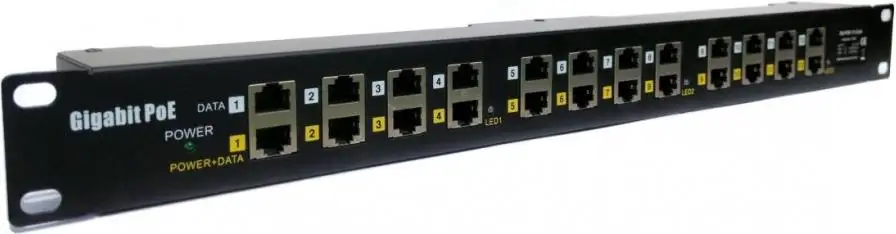 MaxLink POE-PAN12-GB, Professional panel which integrates 12 gigabit passive POE injectors and so it is suitable for powering up to 12 devices with integrated PoE splitter. Outup power range per port 24 - 57V. 19" rack design, LED control for visual monitoring of traffic, two power jack connectors 2,1mm (120W), outgoing ground component for surge filtering on the back panel, reversible insurance against electric current fluctuation (OCP protection 650 mA) on each port 2x power input connectors (2.1 mm jack 60W). 2 x Power adapters must be bought seperate. Any MIK-GM-xxxx model will work. If you use 1x 24V Power Adapter 1x 48V Power adapter all ports can inject out 24V or 48V PoE power. Data pins 1 2 3 6 4 5 7 8, PoE Power Pins 4 5 7 8- (48V)