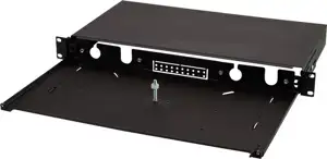 Sliding type steel housing, 480x44x243 mm, RAL9005 black • Capacity up to 24 Ports for LC Duplex or SC Simplex • Modular design, without front panel, pigtails, or adapters • Quick-mount feature allows easy installation • Suitable for field-termination and fusion splicing with pigtails • M6 fixing set, cable ties and cable glands included