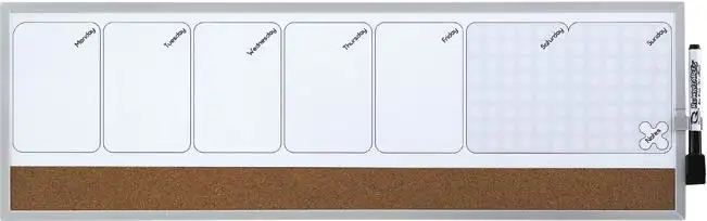 tjedna; dimenzija: 58,5x19 cm; ploča bijela zidna magnetna i pluto ploča; srebrni aluminijski okvir; koriste se markeri za bijelu ploču i čavlići za pluto ploču; sadrži: 2 magneta, crni magnetni marker sa brisačem i pribor za montažu