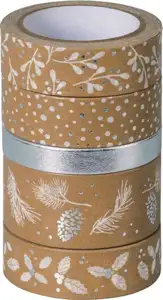 dimenzija: 3 trake 12 mm x 5 m, 1 traka 18 mm x 5 m i 1 traka 6 mm x 5 m; sa visokosjajnim efektom; 1 jednokratni stalak; idealno za: dekoriranje (poklona, kutija, staklenki..), izradu čestitki, pozivnica i raznih drugih rukotvorina; u kartonskom stalku sa rubom za lakše kidanje; set od 5 komada; u plastičnoj kutiji; blister
