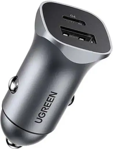 Ugreen fast car charger USB-A / USB-C 30W PD PPS gray (CD130) - Access to the charger in the car is important regardless of the length of the route. Thanks to this dual-port device from Ugreen, you can conveniently charge two devices at the same time. Its operation is very simple - just plug it into the cigarette lighter socket. You can do it with one hand and enjoy access to a charger for your electronic equipment.Charge two devices at the same time - Two sockets to which you can connect your devices are a great convenience, especially if you are not traveling alone. Currently, almost everyone has several electronic devices that need to be charged from time to time, which is why one socket may not be enough. In this charger you have two at your disposal - USB-A and USB-C, so you can connect to them almost any equipment currently available on the market.Aesthetic appearance - You do not have to worry that the interior of your vehicle will look unsightly after equipping it with a charger. The accessory is small and unobtrusive. Plugged into the cigarette lighter socket, it gives the impression of a factory-made element of the vehicle.Features - Ability to connect two devices at the same time - Overheat protection - Easy installation - Aesthetic appearanceSpecifications - Input: DC12-24V=4A - USB-C output: 5V=3A 9V=3A 12V=2.5A 5V=3A 9V=3A 12V=2.5A - USB-A output: 5V=3A 5V=4.5A 4.5V= 5A 9V=3A 12V=2.5A - Support QC3.0/PD3.0/PPS/FCP/AFC/BC1.2/DCP/APPLE 5V2.4A/Samsung5V2A - Total output power: 30 W max. - Aluminum alloy housing